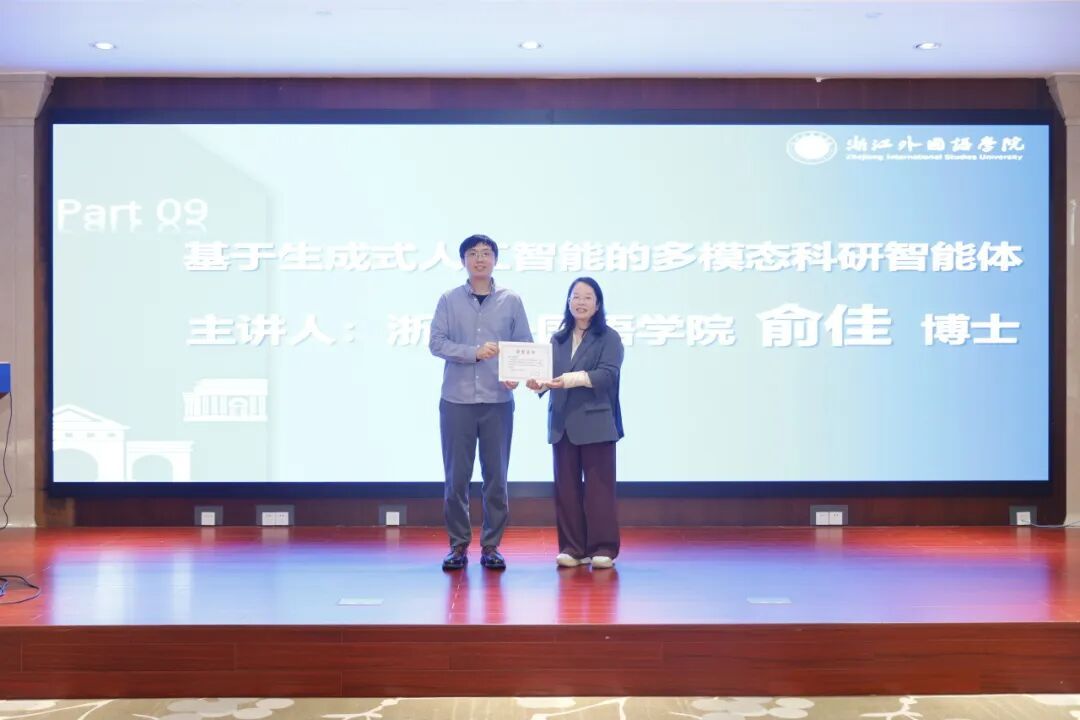 俞佳作了题为“基于生成式人工智能的多模态科研智能体”的报告,提出了一种创新的多模态科研智能体架构。该架构包含四个核心模块,通过实验验证,该智能体在文献综述生成、跨语言数据分析等任务上显著提升了研究效率,为外语科研领域提供了强有力的辅助支持。报告由学会副会长,浙江理工大学饶萍教授主持。