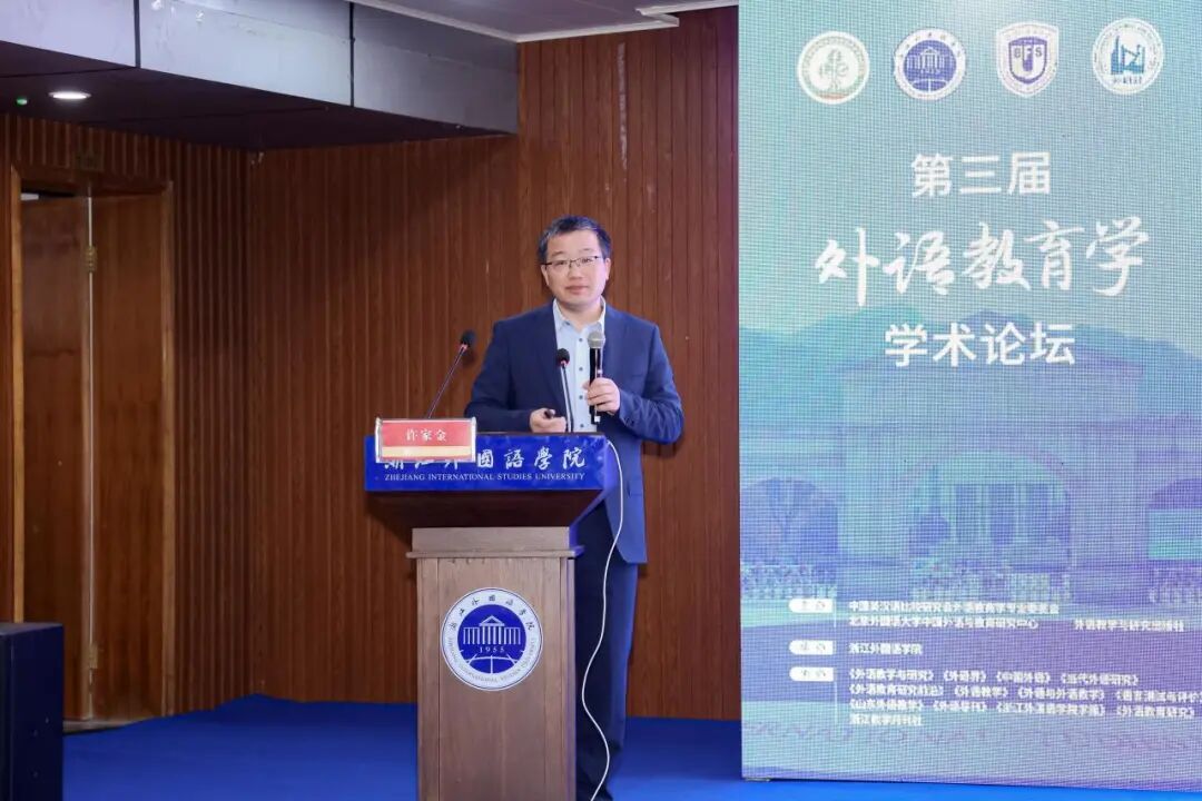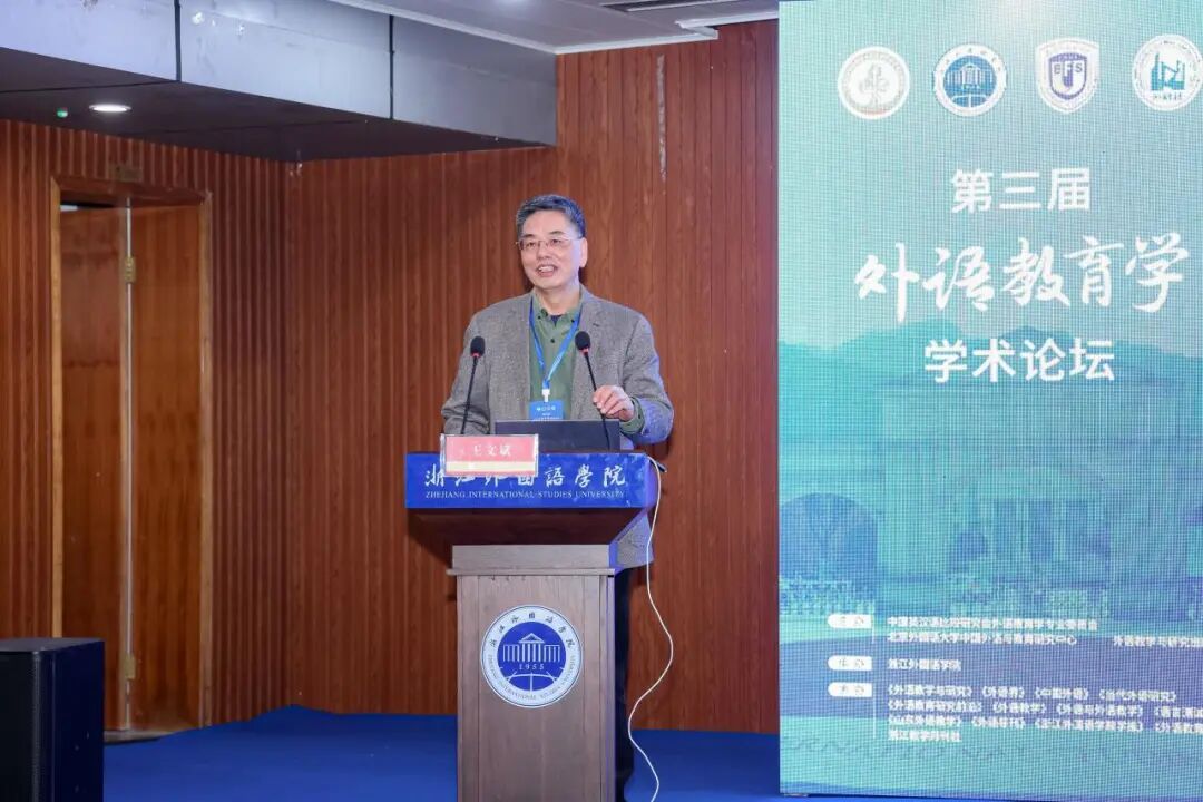 在主旨报告环节,王文斌以“以提升外语教育理念为旨归:话说外语教育学构建的初衷”为题,指出当前学界对外语教育学构建初衷与核心概念仍存在认知不足。他系统阐述了外语教育研究应重视的20个问题包括“外语教育研究需要顾重第一性原理”、“外语教育研究需要顾重以真问题为导向”等,旨在深化学科理解,厘清基本问题,推动学科向系统化、成熟化发展。