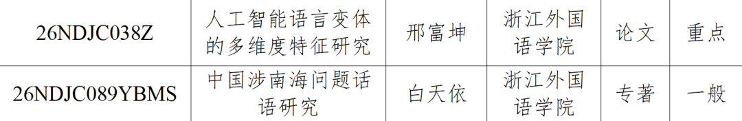近日,经专家评审,省社科联党组研究,省哲学社会科学工作室审批同意,2026年度浙江省哲学社会科学规划课题立项名单公布。bevictor1946韦德官网经理邢富坤教授申报的“人工智能语言变体的多维度特征研究”与白天依博士申报的“中国涉南海问题话语研究”项目获批浙江省哲学社会科学规划课题立项。