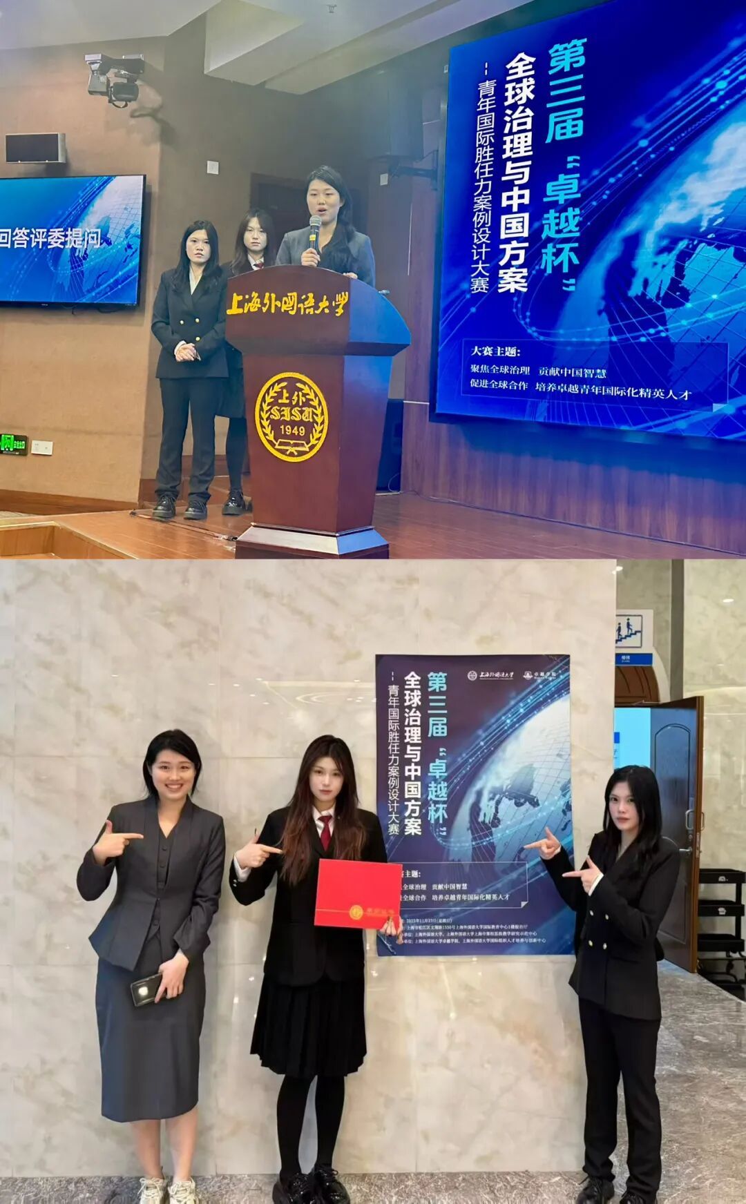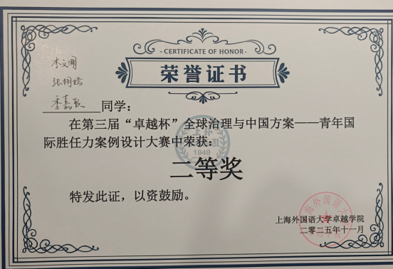 近日,第三届“卓越杯”全球治理与中国方案——青年国际胜任力案例设计大赛圆满结束。在章珏老师的悉心指导下,bevictor1946韦德官网2024级英语6班李文澜、张栩嫣、季嘉欣同学与来自同济大学、外交公司、北京外国语大学、上海外国语大学等多所知名高校的优秀选手同台竞技,最终荣获二等奖的好成绩。