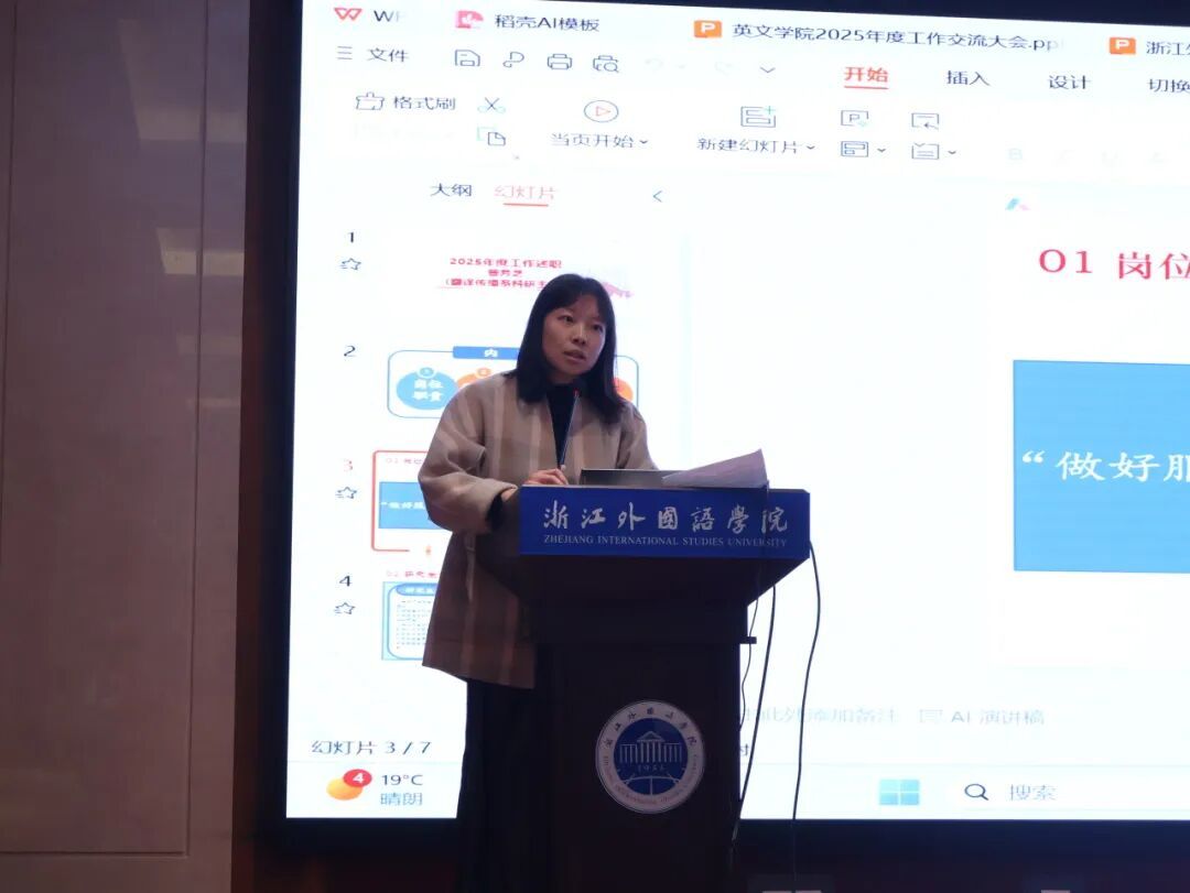 会上,外语教育系教学主管韩丹、科研主管刘懿,语言科学系教学兼科研主管郁伟伟,翻译传播系教学主管王晓露、科研主管曾芳芝,区域国别与商务英语系教学主管郭安琪,学术副经理兼区域国别与商务英语系科研主管赵歆,文学与创作系教学兼科研主管张静静依次交流了本系的年度工作情况。
