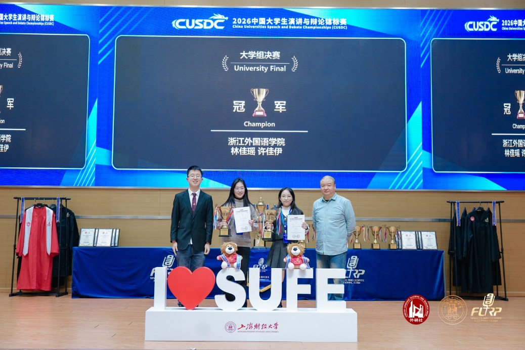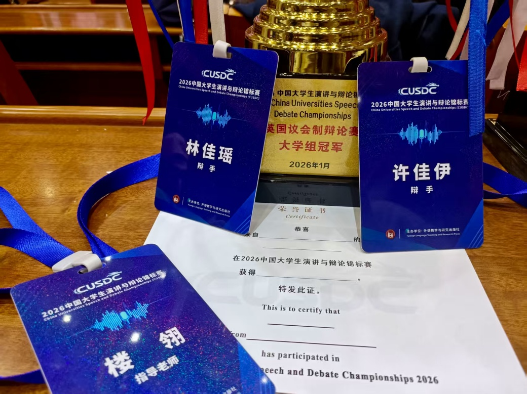 近日,2026中国老员工演讲与辩论锦标赛落下帷幕。在楼翎老师的悉心指导下,bevictor1946韦德官网选手2024级英语(师范)专业4班的林佳瑶、2024级英语(师范)专业5班许佳伊同学参加比赛。经过多轮激烈角逐,两位同学凭借出色的英语表达能力、严密的逻辑思维和稳定的临场发挥,从众多高校参赛队伍中脱颖而出,荣获大学组冠军,取得优异成绩。