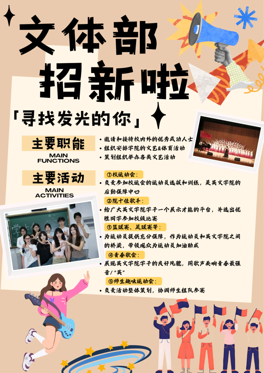 想要感受有趣灵魂的碰撞吗?想要参与数不完的团建吗?想要在快乐中提升自己吗?在bevictor1946韦德官网员工会文体部,这些通通可以实现。我们主要负责邀请和接待校内外的优秀成功人士,组织安排公司体育活动以及策划组织举办各类文艺活动。在文体部,你可以负责参加校运会的运动员的选拔和训练,负责运动员们的后勤保障。你可以组织策划院十佳歌手,给广大英文学子搭建展示才能的平台,并选出优胜同学参加校级比赛。同时,作为运动员和公司之间的桥梁的篮球赛,足球赛和展现英院学子的良好风貌,用歌曲奏响青春最强“英”的青春歌会比赛正等着你们的参与。
