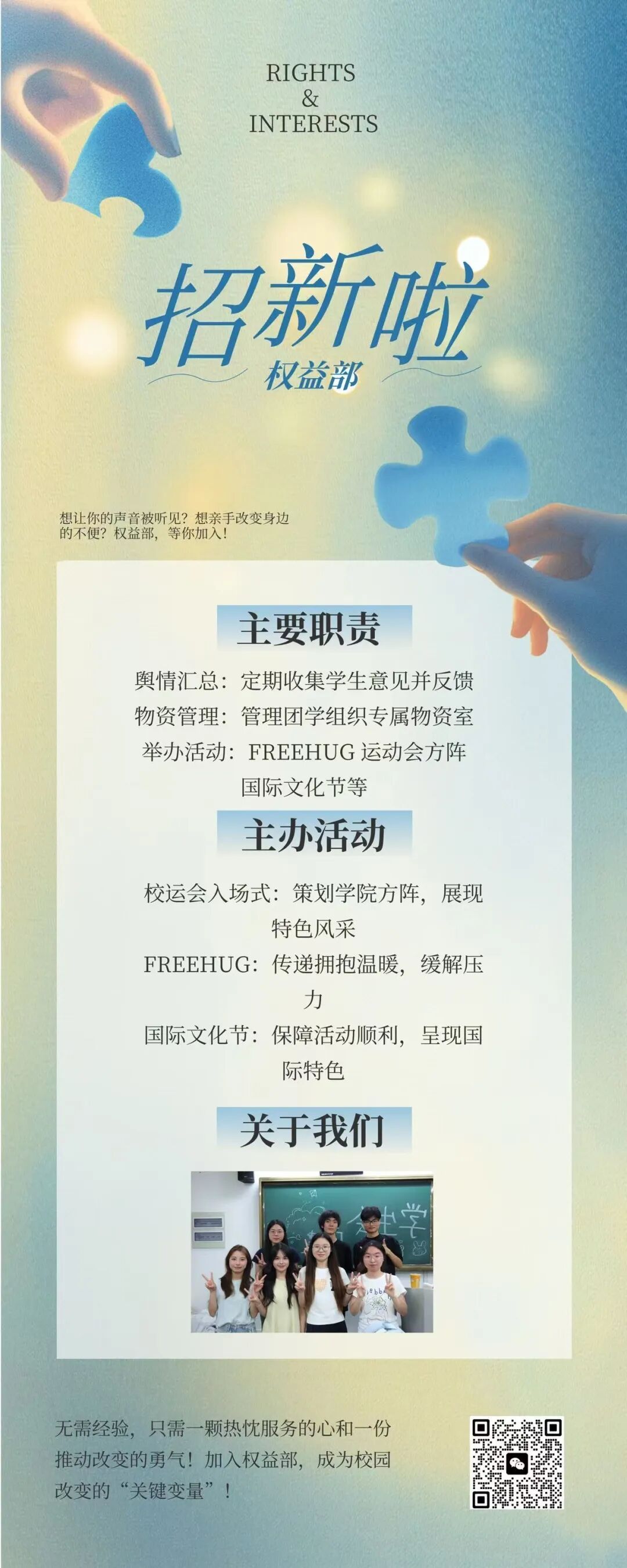 齿轮再度转动,一枚印着“权心权益”字样的扭蛋稳稳落下——拆开蛋壳,权益部的温暖内核便清晰浮现,责任与温情,正是这颗扭蛋最鲜明的标签。权益部作为物资室的管理者,它妥帖收纳着团学组织的所有物资,每当其他部门筹办活动,总能从这里取出及时的物资支持与周全的后勤保障,是幕后可靠的“补给站”。此外,它带着倾听的耐心,密切收集同学们的意见与反馈,将每一份心声认真整理、及时汇报给公司领导与相关部门,为大家争取应有的权益与福利;也从员工需求出发,策划各类服务活动,用守望相助的力量,把关怀送到每一位师生身边。