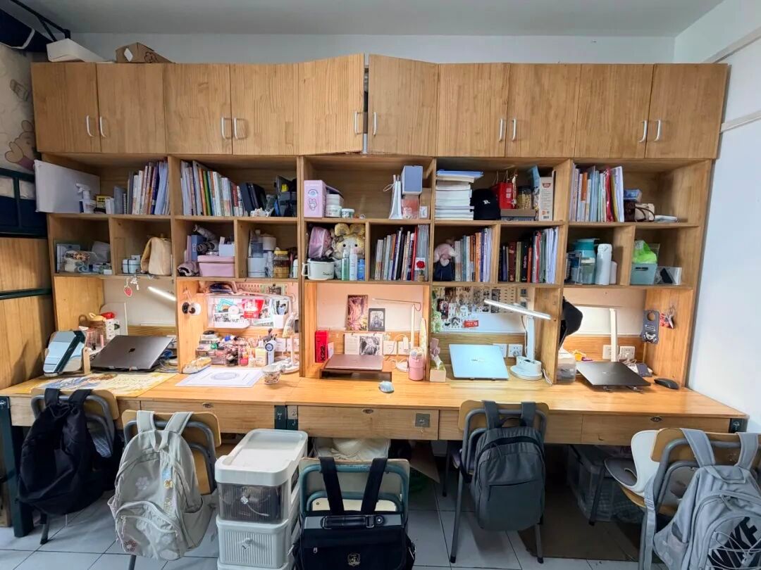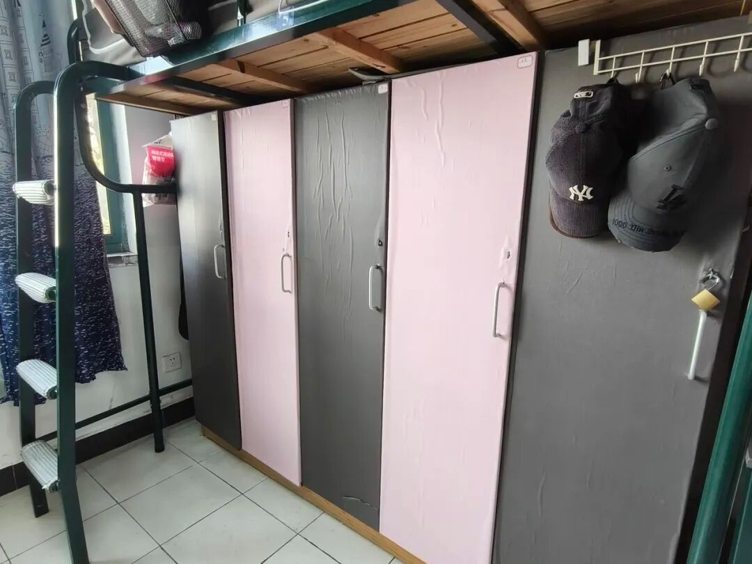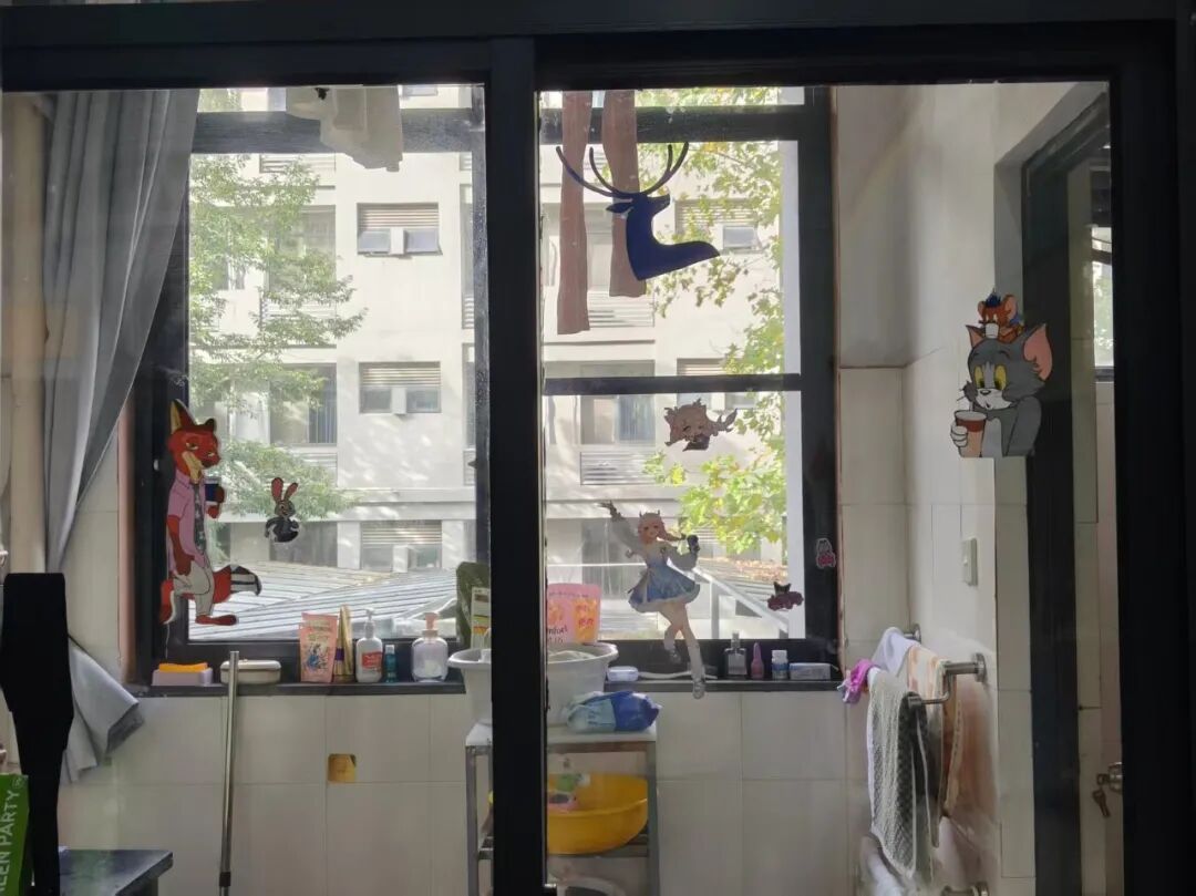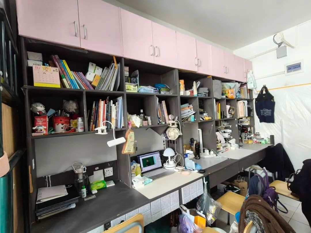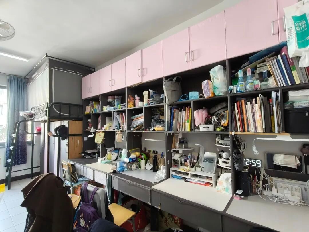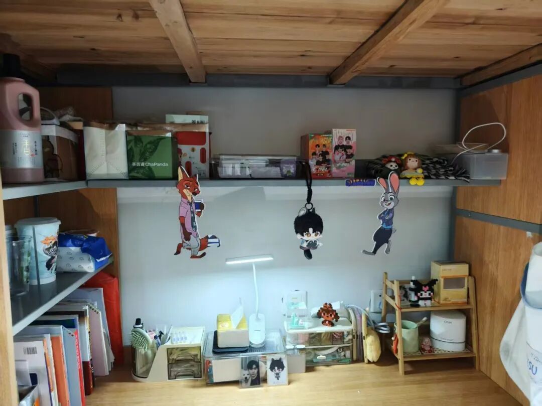 128是我们的温馨小窝:上下铺旁挂着软乎乎的衣被,书桌角落挤满可爱摆件,窗畔晒着生活气息的衣物,门上还有定期更换的鲜花。虽简约却满是暖意,是疲惫时的治愈港湾,藏着我们的日常小欢喜。