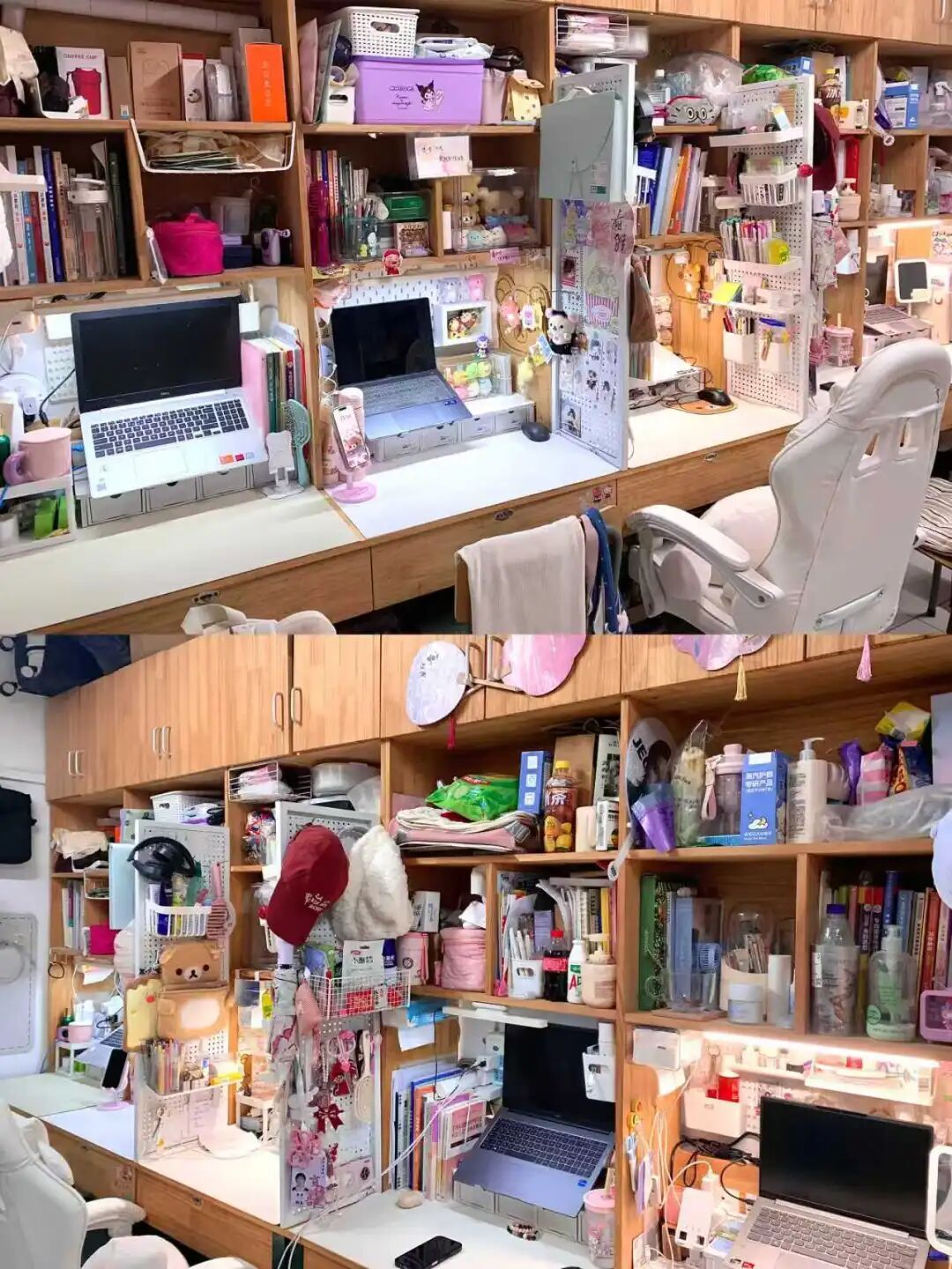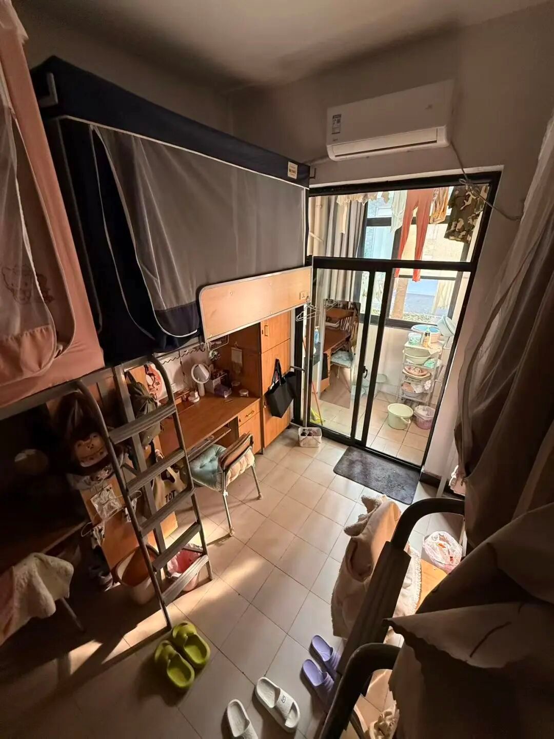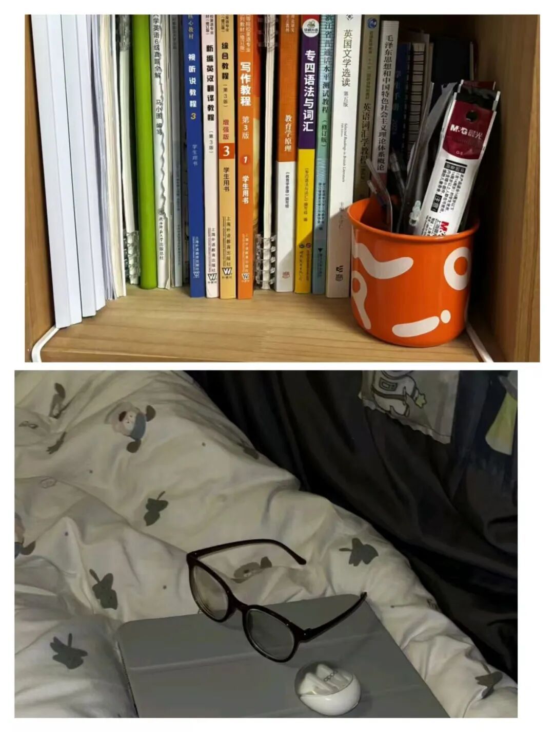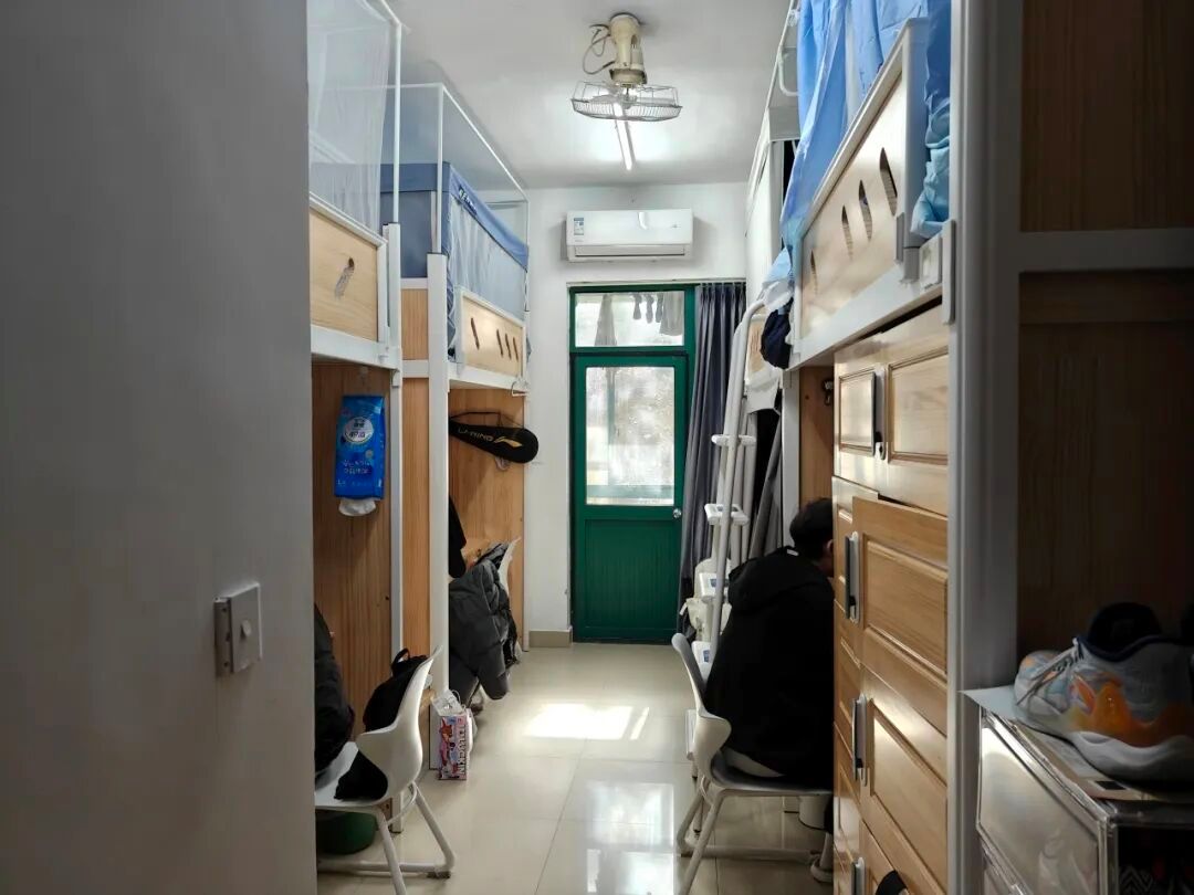 128是我们的温馨小窝:上下铺旁挂着软乎乎的衣被,书桌角落挤满可爱摆件,窗畔晒着生活气息的衣物,门上还有定期更换的鲜花。虽简约却满是暖意,是疲惫时的治愈港湾,藏着我们的日常小欢喜。