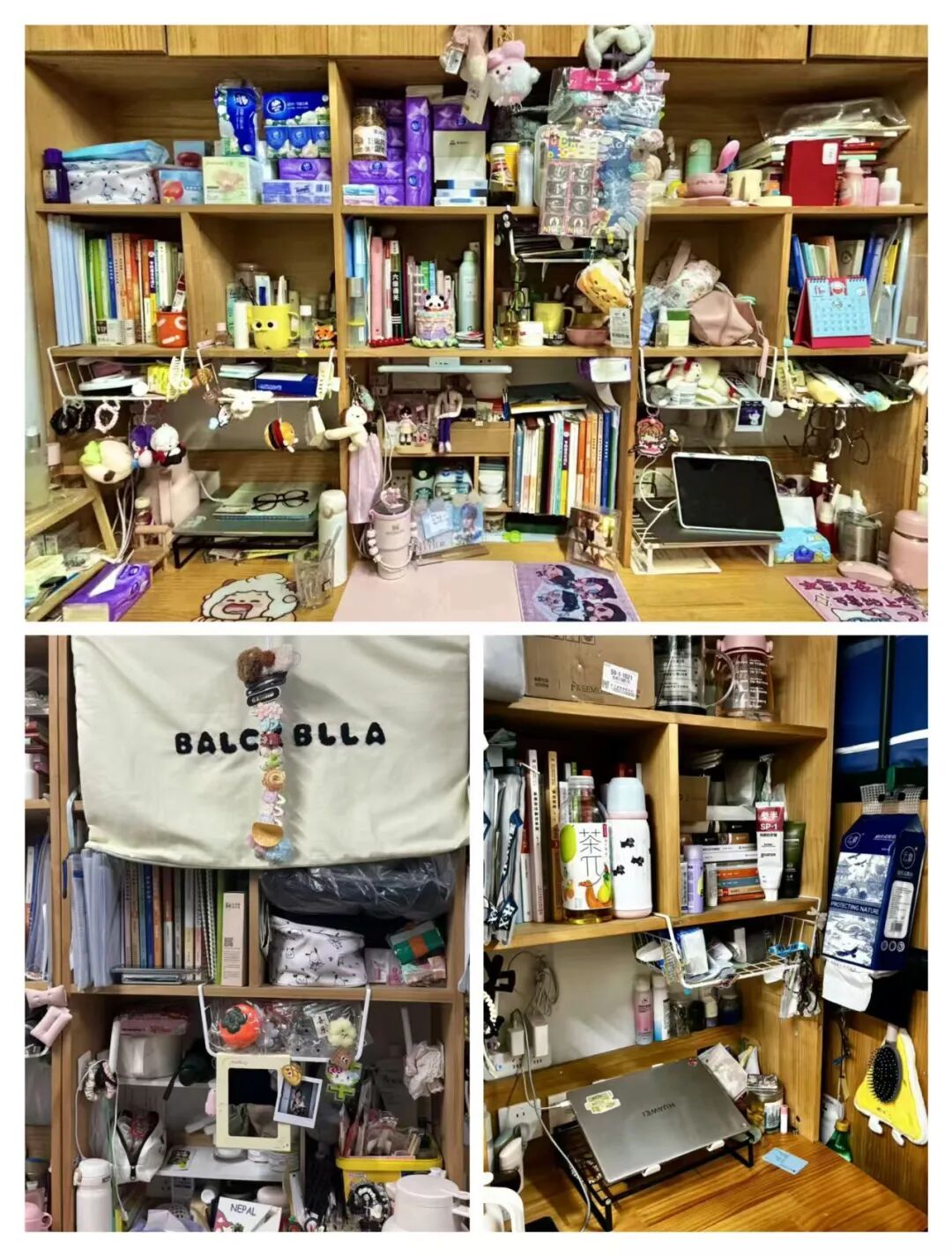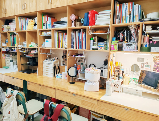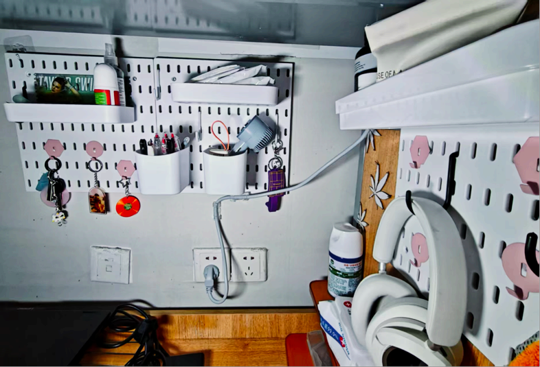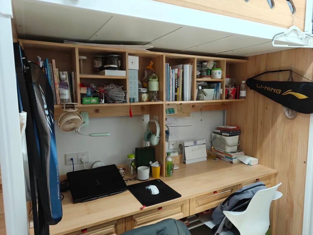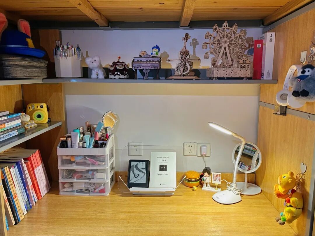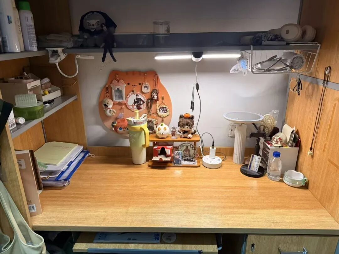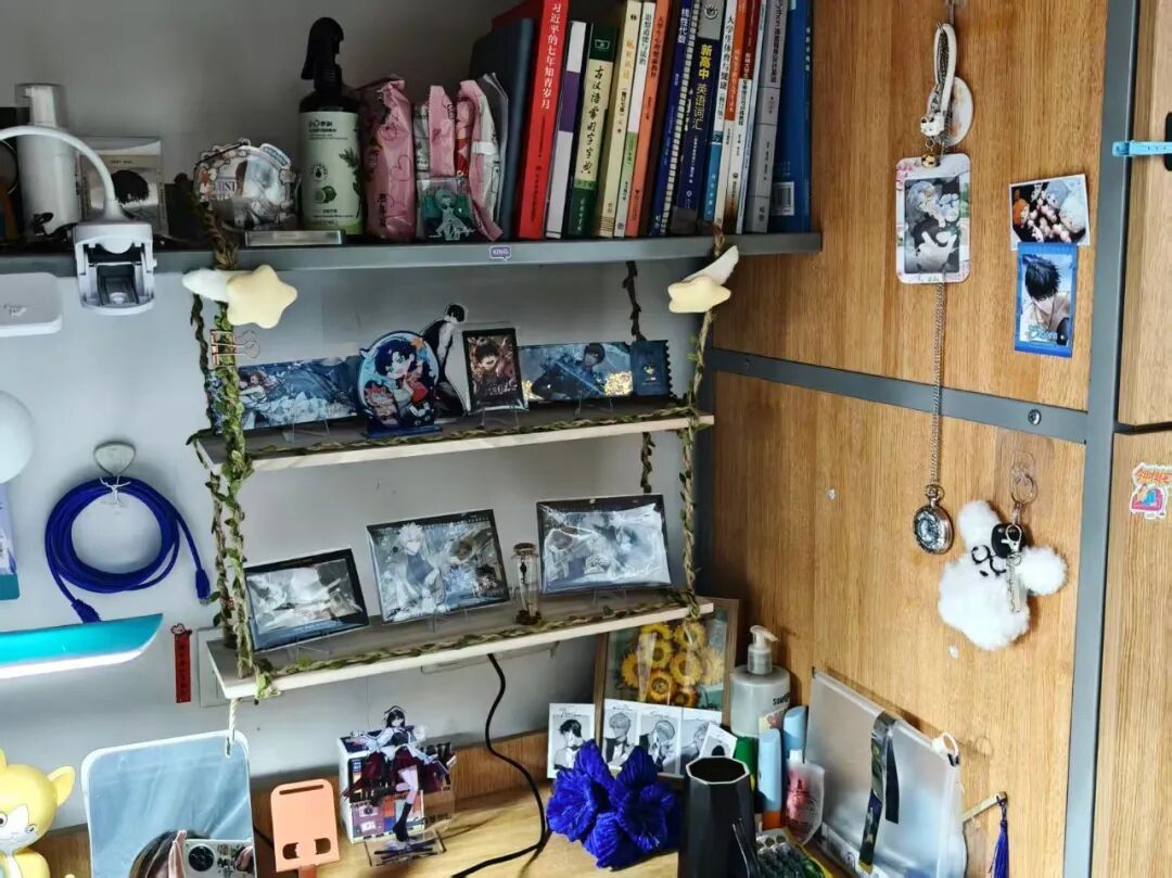 我们走的是简约风。宿舍内物品摆放整齐,地面干爽洁净,屋子宽敞明亮。为了增添生活气息,我们养了些绿植,寝室的女孩们还为宿舍配备了除湿机与香薰机。个人空间内,我们各自用自己喜欢的元素装饰桌面与柜子,让宿舍温馨又舒适。