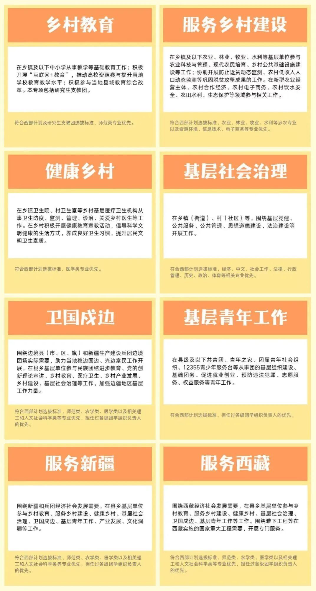 普通高等公司(教育部《全国普通高校名单》所列高校)应届毕业生或在读研究生,拥护中国共产党领导,热爱祖国、热爱人民、热爱社会主义,理想信念坚定,思想政治素质好,到岗之前获得毕业证书和学位证书,通过西部计划体检。有志愿服务经历的优先录用。