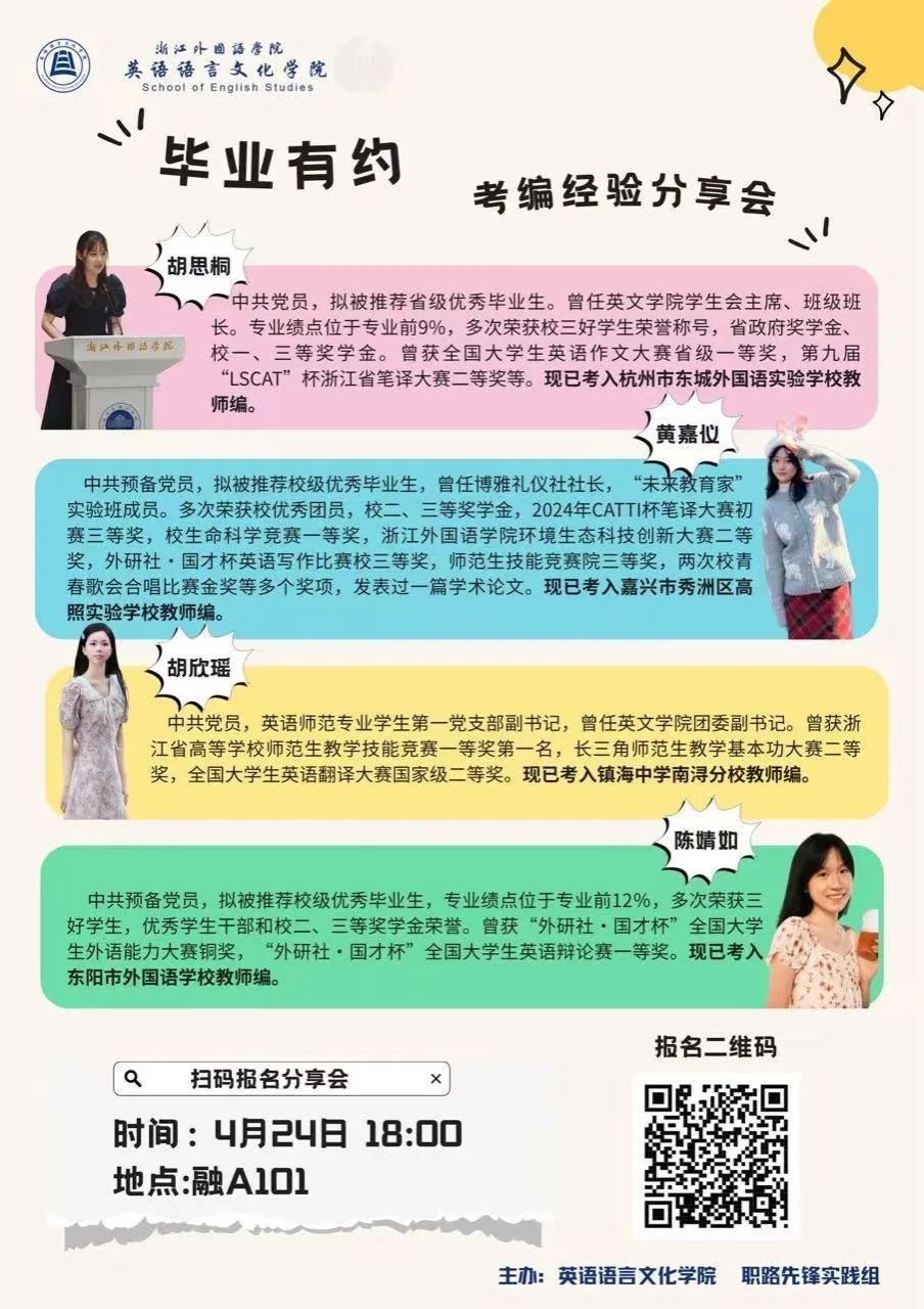 为帮助英院学子更全面的了解考编信息,建立清晰的备考目标,做好科学的备考规划,“E+”圆桌派·“毕业有约”邀请四位成功上岸的学姐分享考编心路历程与备考策略,讲述笔试、面试实战技巧与避坑指南。干货满满!