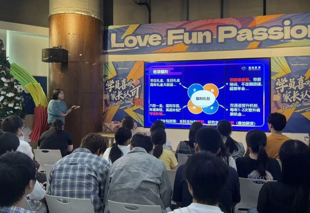 在宣讲环节,组织发展经理Suvi老师和员工们分享了走进瑞思的三大理由,她指出瑞思教育致力于培养3-12岁儿童的综合能力,通过素质教育帮助孩子成为敢于提问、勇于探索、自主学习、自我管理、自信表达的未来人才。同时,瑞思拥有一群充满生命力、相互激励的团队成员,重视共同目标下的协作与成长,营造开放、积极的工作环境。