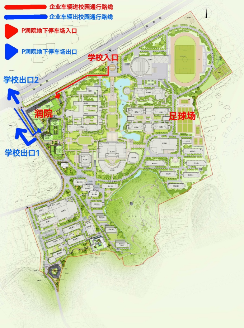 2.校内车位有限,建议您乘坐公共交通、网约车或出租车等参加本次招聘会。参会企业名单公布及进校备案审批程序启动后,校内车位根据登记与官方平台预约报备情况先到先得,建议用人单位早登记、早预约、早抵达。参会企业车辆集中统一停放于润院(新建)地下停车库,参会人员再步行至招聘会场地。参会期间,车辆单向行驶,须从留和路主校门(正门)入校后右转,从北(靠近望 A)地下入口进入,西(外语路)出口驶出直行至图示出口1(外语路)出校,或沿围墙边校内道路至图示出口2(留和路)出校。